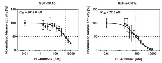 The IC50 value using the CK1ε-specific inhibitor PF-4800567 was calculated to be 2012 nM for GST-CK1δ and 72.3 nM for 6×His-CK1ε (Figure 10), thereby confirming the inhibitor’s selectivity for CK1ε. Furthermore, the suggested workflow for determination of highly comparable parameters for SMIs allows the conversion of the calculated IC50 values for all tested competitive CK1-specific inhibitors to Kic by implementing Equation (3) as given in the introduction section. By providing Kic, the results will be made highly comparable even among different enzymes. All IC50 values, which were determined in the present study along with the resulting Kic values are summarized in Table 2. IC50 values previously reported in literature are also included in Table 2. However, it is important to note that these values cannot be easily compared to the values presented here due to significant differences in their experimental and reaction setup (such as luminescent vs. radioactive kinase assay, use of kinase proteins without or with different affinity tags, use of protein or peptide substrates).