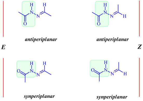 The N-acyl hydrazone backbone (-C(O)-N-N=C<) is an assemblage of amide and imine functional groups which is likely to exhibit geometric as well as conformational stereoisomerism [20]. Rotation along imine C=N linkage may give rise to two geometrical stereoisomers, i.e., E and Z forms. By means of 1H- and 13C NMR data, Palla and coworkers speculated that N-Acyl hydrazones of aromatic aldehydes tend to exist in E configuration in solid form [21]. In solution too, the less hindered E is the preferred geometry; however, the Z isomer can be detected in fewer polar solvents [22,23]. The configurational interconversion in solution is quite slow due to restriction of rotation about C=N bond and the achievement of equilibrium in solution requires hours (or even days) [24]. The E/Z switching usually requires energy and can be achieved thermodynamically [20,24], photochemically [25,26,27], or chemically by base or acid catalysis [28,29,30,31].