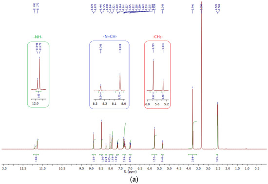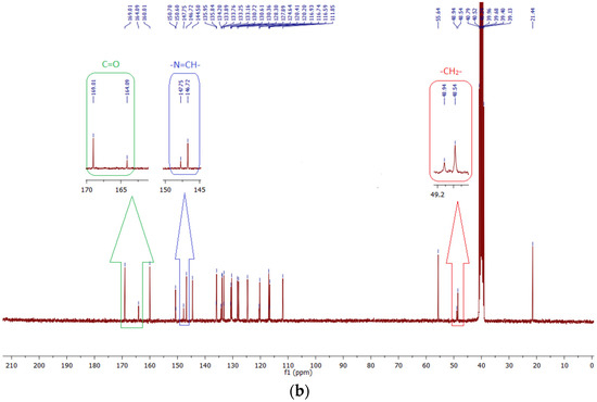The paired peaks, emerging as two discrete sets of singlets in the spectra of the synthesized compounds, are designated to amide C(O)NH, imine N=CH and methylene -CH2- protons. For C(O)NH and N=CH protons, the downfield signals are assigned to the antiperiplanar (ap) conformer while the upfield signals to the synperiplanar (sp) conformers, as established from literature [42,43,44]. On the contrary, for methylene protons the upfield signal is denoted as anti- while downfield signal as the syn- isomer, as is evident from the integration of the signals relative to those of imine and amide peaks (Table 1).