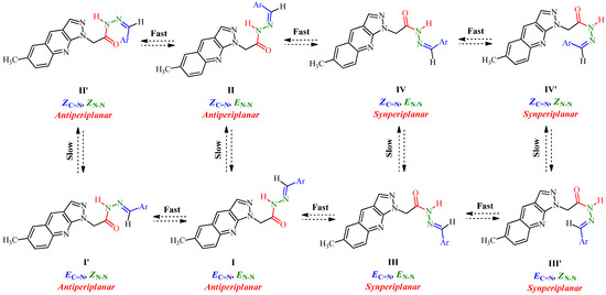 In all the 1H NMR and 13C NMR spectra, a particular pattern of two explicit sets of signals for certain protons was observed. Although similar in pattern, the heights of the duplicated peaks varied from compound to compound indicating the existence of two stereoisomers in solution in dissimilar ratio (Figure 2). Structures of the two isomers in DMSO-d6 are resolved by considering all the plausible configurations and conformations arising due to C=N, C(O)-NH and N-N bond rotations in order to determine whether the duplication of some peaks in their 1H- and 13C-NMR spectra was associated with a mixture of geometric (E/Z) stereoisomers or rotational stereoisomers (synperiplanar and antiperiplanar).