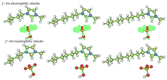 The Fukui function of the nucleophilic attack and electrophilic attack calculated at B3LYP/6-31++G(d,p) for [BMIM]HSO4 (left), [HMIM]HSO4 (middle) and [OMIM]HSO4 (right).