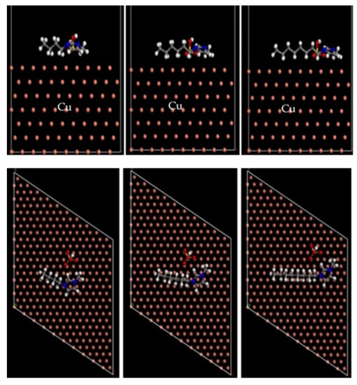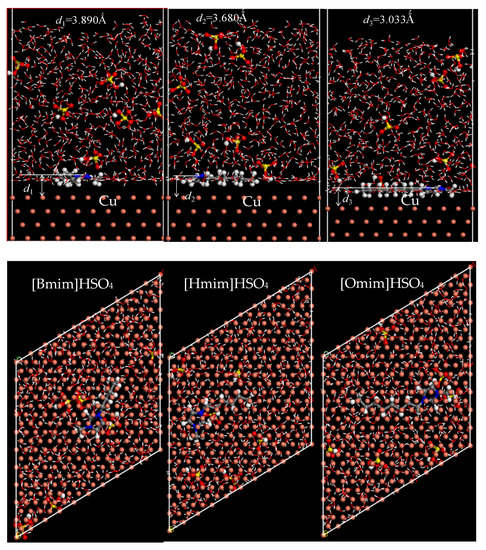 The stable equilibrium adsorption configurations of three ILs inhibitors of [BMIM]HSO4, [HMIM]HSO4, and [OMIM]HSO4 on the Cu(111) surfaces in a vacuum and in a sulfuric acid solution, are presented in Figure 5 and Figure 6.