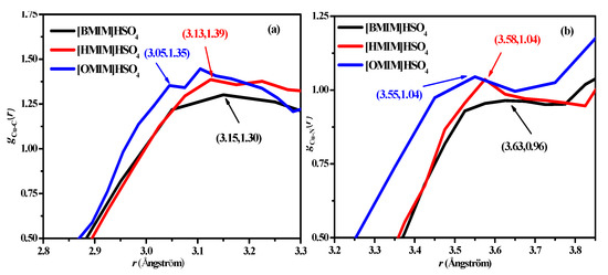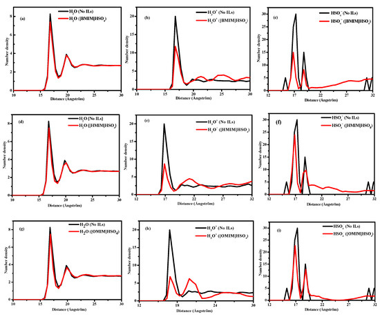 Corrosion inhibition mechanisms can be revealed by further analyzing the radial distribution functions g(r), diffusion coefficient (D), and number density profiles [35,36]. The radial distribution function gA-B(r), obtained by molecular dynamics simulation, can be used to analyze the interaction between atom A and atom B. In the sulfuric acid solution, the radial distribution functions gCu-C(r) and gCu-N(r) of the Cu surface and the two atoms (C and N) on the imidazole ring of the ILs are shown in Figure 7. It can be seen that the initial peak positions of gCu-C(r) and gCu-N(r) for the three ionic liquids of the N and C atoms are [BMIM]HSO4 < [Hmim]HSO4 < [Omim]HSO4, which suggests that the interaction between the Cu(111) surface and the ILs are gradually enhanced from [Bmim]HSO4 to [Omim]HSO4. The initial peak positions of the radial distribution functions of Cu and C are smaller than those of Cu and N, indicating that the interaction between C and Cu is larger than that between N and Cu. Moreover, the positions of the first peaks of the radial distribution functions of the C and N atoms of the imidazole ring and the copper surface are greater than 3 Å, which is greater than the sum of the covalent bonds between the atoms and the copper surface, indicating a physical adsorption process.