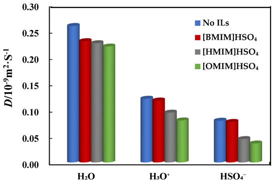 In Equation (1), the is MSD, <…> is the ensemble average, and N is the number of particles in the system and ri(t) represents the position vector of the i atom or molecule. D reflects the diffusion rate of corrosive particles. The diffusion coefficient of three corrosive particles from the molecular dynamics simulation is shown in Figure 9. It can be found that the D of the three corrosive particles gradually decreases after adding ILs of [Bmim]HSO4, [Hmim]HSO4, and [OMIM]HSO4, which indicated that the addition of the ILs can effectively inhibit the diffusion of corrosive particles. When ILs are added, they can adsorb onto the Cu(111) surface with the -C=N- of the imidazolium ring and S atom in HSO4− to form a protective film, which blocks the transfer of oxygen and corrosive particles from the bulk solution to the copper/solution interface. Therefore, the diffusion coefficient of three corrosive particles gradually decreases with adding ILs. From Figure 9, we found that the order of the inhibition ability is [Bmim]HSO4 < [Hmim]HSO4 < [OMIM]HSO4, and [OMIM]HSO4 is the best inhibitor. This is consistent with the above theoretical results (in Section 2.1) and experimental results that the compound [OMIM]HSO4 is the best inhibitor and the inhibition ability follows the order: [OMIM]HSO4 > [HMIM]HSO4 > [BMIM]HSO4 [1].
