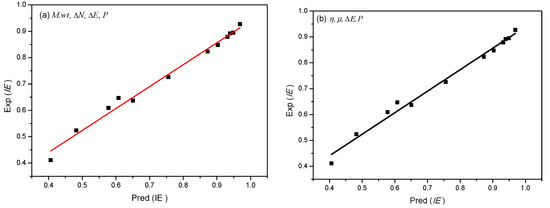Nonlinear correlation between the predicted inhibition efficiency pred(IE) obtained by Equation (4) (a) and Equation(5), (b) and the experimental value exp(IE).