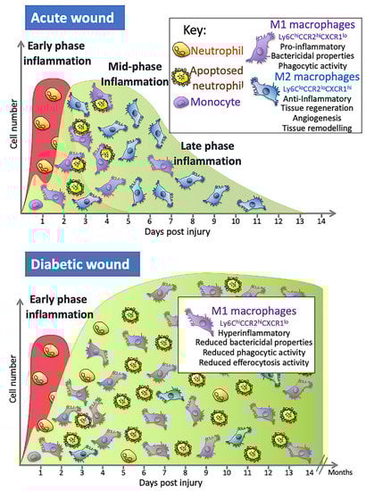 During the early stages of inflammation in an acute wound, the wound is predominantly populated with M1 macrophages that are pro-inflammatory. A switch in the predominant phenotype is seen later in the inflammatory phase, where the majority of macrophages are M2. In wounds of people with diabetes, macrophage numbers are altered and secrete more pro-inflammatory cytokines, have reduced phagocytic and efferocytosis abilities and are less likely to switch to the M2 phenotype in the mid- to late-inflammation phase that is as seen in normal acute wounds.