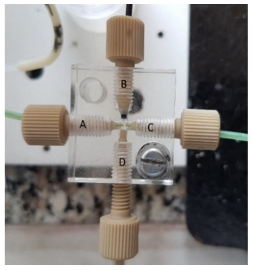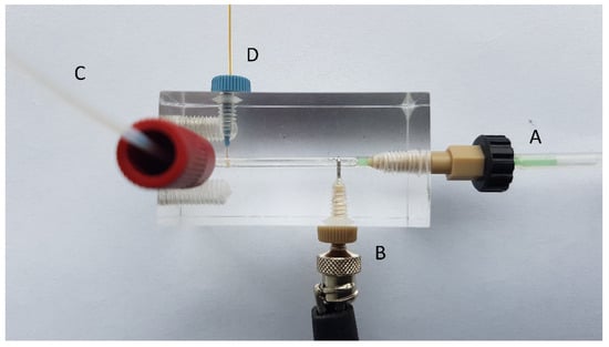 Photograph of a flow gating interface (photo from the authors’ laboratory). A—sample capillary, B—BGE flow in, C—separation capillary, D—BGE flow out.