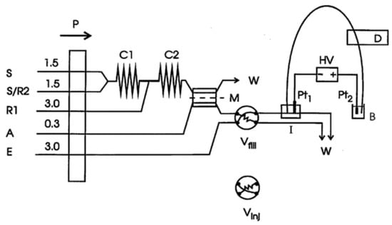 While the interface itself is simple, the CE analysis process requires supporting equipment for interchanging the sample and the background electrolyte (BGE), for providing liquid flows for rinsing capillaries (such as NaOH or H2O), as well as equipment for sample cleaning and processing, since the direct sampling of flow is rarely possible. An example of a set-up that consists of all listed supporting equipment is the publication by Kuban and Karlberg [6]. The equipment was applied to the analysis of real samples such as soft drinks, vinegar, and wine. Besides an FIA–CE interface, it also featured an online gas diffusion membrane separator, which was coupled to a capillary electrophoresis system via the interface (see Figure 2). The sample flow, S, was merged with reactant solutions R1 and R2 at the reaction coils C1 and C2 to transform the analytes of interest into their respective gaseous forms. These transformed gaseous analytes permeated through a polytetrafluoroethylene membrane, M, into an acceptor stream, A. The continuously flowing acceptor stream was led into the interface through a manually operated mechanical valve that performs exchange between the acceptor (sample) and the BGE flow, E. The receiving carrier stream of the sample, a chromate buffer, brought 50 μL of the sample solution to the FIA–CE interface, into which one end of the separation capillary was inserted. As follows from the logic of the set-up, no offline sample pretreatment was required.
