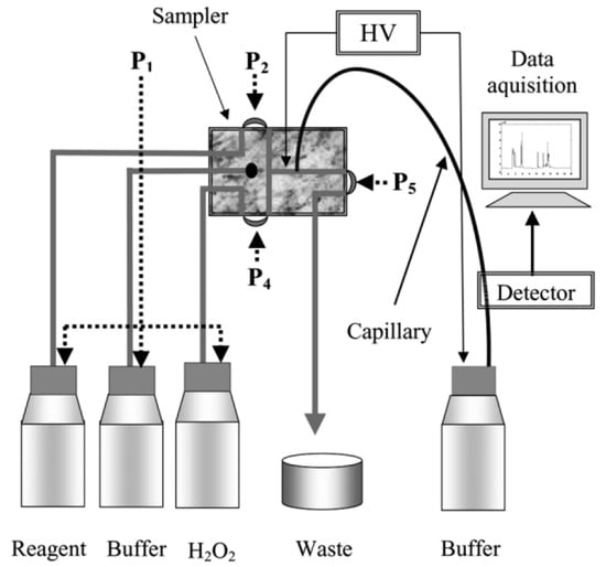 Vaher et al. implemented gas exchange pumps for accomplishing complete automatization of the FIA–CE coupling [7] (see Figure 3). In this set-up, the interface body is completed with four polymeric membranes, which can close or open the channels for the sample, P2, for the buffer (shown as dot on the interface block) or for the oxidant (H2O2), P4, flow. Pressure P5 closes the waste channel. Pressure P1 initiates liquid flow in the required channel if the corresponding pressure is released from the membrane. The solenoid valves (not shown in the figure) provide closing pressure to the membranes. Solenoid valves are, in turn, controlled by computer, so complete automatization and programmability of the instrument is established. This equipment was used for the determination of the antioxidative potential of various bioactive phenols found in plant, fruit, and vegetable extracts.