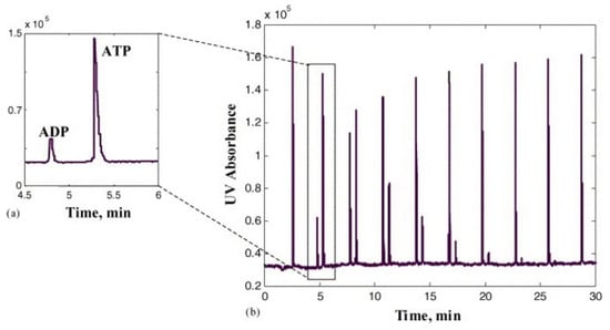 The same FIA–CE interface with membrane valves and gas exchange pumps (controlled by solenoid valves) has been used for studying the flows originating from various bioprocesses. Among these processes are monitoring of the enzymatic conversion of adenosine triphosphate to adenosine diphosphate [8], monitoring of the kinetics of the metabolic conversion of ATP to ADP catalyzed by MgATPases of muscle Gastrocnemius skinned fibers [9], monitoring of the degradation of phenols by Rhodococcus bacteria [10], and monitoring of the bioaccumulation of Cu, Zn, Co, and Cd by the Rhodococcus sp. bacteria (isolated from highly polluted technogenic soil in Estonia) [11]. As an example of these applications, in Figure 4, electropherograms describing the conversion of ATP to ADP by hexokinase are shown. Peaks for the product (ADP) increase, while peaks for the substrate (ATP) decrease [8].
