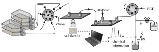 Breadmore’s group (from the University of Tasmania, Tasmania, Australia) developed an elaborate automated platform for the online, real-time monitoring of suspension cultures based on FIA–CE technology. It integrates microfluidic components for cell counting and filtration with a CE separation technique. This is perhaps the most sophisticated FIA–CE combination reported thus far. Variants of this platform for different applications have been demonstrated in several publications [12,13,14]. For example, in the latter work, equipment for the monitoring of the extracellular content from five parallel suspension cultures was developed. This equipment combines cell density measurements with high-resolution CE separations every 12 min for four days (see Figure 5). The set-up features selector and switching valves, which provide the fluidic control required for sampling from a culture during the analysis of the previous sample from another culture. The sample is sequentially withdrawn from one of the five culture flasks, controlled by the selector valve. To prevent cross-contamination between samples, a carrier solution (5% methanol) is used to rinse the connecting tubing to prevent cross-contamination between samples. Cell density measurements are performed using automated image analysis. The sample is then transported to a microfluidic separator, an H-filter, whose role is to prevent debris from the cell culture entering the capillary. The H-filter extracts analytes into a cell-free solution flow, which is analyzed by CE with a contactless conductivity detector by inserting the inlet end of the separation capillary directly into this flow (as described above in Figure 1).