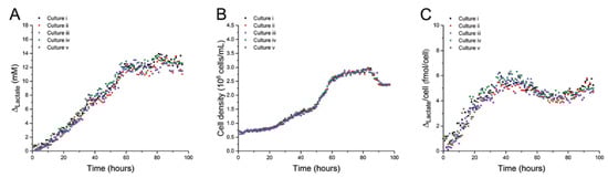 Simultaneous monitoring of five parallel cell cultures of Jurkat cells over four days [14]. (A) Changes in lactate concentration, (B) changes in cell density, and (C) lactate concentrations standardized on cell density.