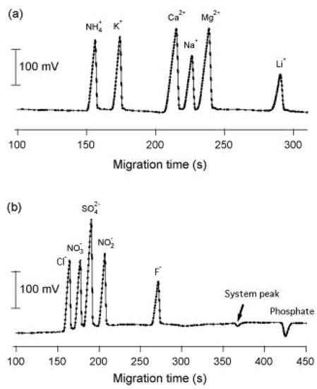 Electropherograms of standard solutions containing either inorganic cations or inorganic anions prepared in deionized water [15]. (a) Cations (50 µM), dispensed volume of 40 µL; (b) anions (50 µM). BGE: His 12 mM, 18-crown-6 2 mM adjusted to pH 4 with acetic acid. Capillary internal diameter = 50 µm, length l/L = 35 cm/60 cm; high voltage = 20 kV. Reprinted with permission from Elsevier.