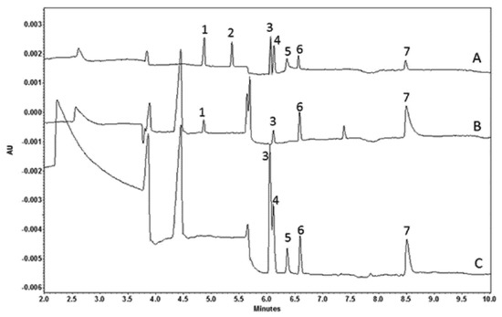 Electropherograms of online analysis of carboxylic acids during a bioreactor cultivation of K. lactis [19]. (A) Separation of standards at 50 mg/L, (B) bioreactor sample at 0 h, and (C) bioreactor sample at 60 h. Peak assignments: 1, formate; 2, malate; 3, acetate; 4, glycolate; 5, glyoxylate; 6, PIPES; 7, gluconate. Reprinted with permission from ACS.