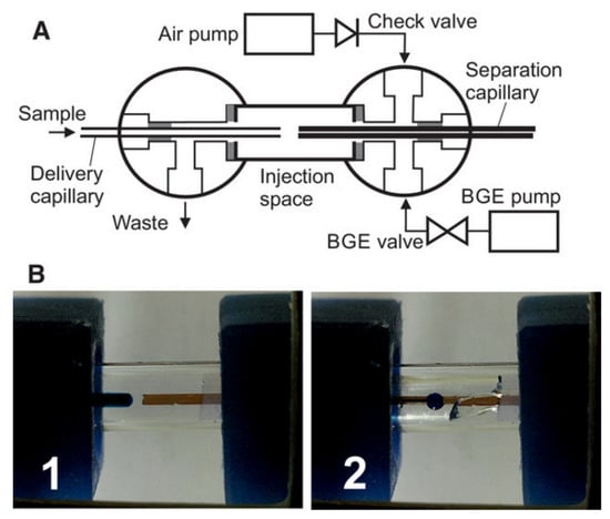 - Opekar, F.; Tůma, P. An air-assisted flow-gating interface for capillary electrophoresis. Electrophoresis 2019, 40, 587–590. [Google Scholar] [CrossRef]