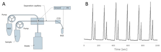 An example of a simple FIA–CE interface. (A)—experimental set-up. (B)—set of electopherograms of anions of Tallinn (Estonia) tap water (recorded by switching of the peristaltic pumps). Peaks: first, Cl− and second, SO42−. Electrophoretic conditions: BGE- 1M acetic acid, HV = 10 kV, capillary: 20 cm length and 75 µm internal diameter.