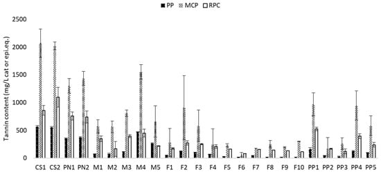 The tannin content in wines from interspecific species was highly variable compared to Vitis vinifera wines, which was likely due to the low number of Cabernet sauvignon and Pinot noir wines (Figure 1). Within cv. Marquette, the tannin content was the highest in M4 at 470 mg/L with the PP method and was the lowest in M1 and M2 with the same method (75 mg/L). Within cv. Frontenac, the tannin content was the lowest in F6 at 17 mg/L with the PP method (below the limit of quantification) and the highest in F2 and F3 at 123 mg/L with the same method (Figure 1). For the Petite pearl cultivar, the tannin content was the lowest in PP2 and PP3.