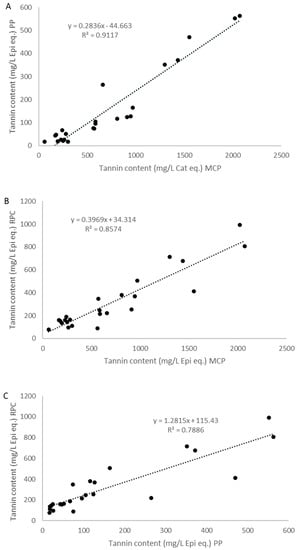 Linear regression analysis of tannin content in red wines of Cabernet sauvignon, Pinot noir, Petite pearl, Marquette, and Frontenac varieties determined using methylcellulose precipitation (MCP), protein precipitation (PP) (A), and reversed-phase chromatography (RPC) methods (B,C).