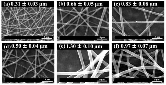 SEM images of (a) PLA/CNC, (b) PLA/CNC-g-PLLA, (c) PLA/Ag, (d) PLA/chitosan, (e) PLA/HA, (f) PLA/graphene e-fibers, as well as their corresponding average diameters.