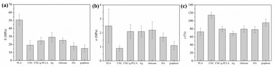 On the other hand, the inorganic NPs, HA and Ag, and graphene did not change the tensile strength in a statistically significant manner, with values of 2.2 ± 0.6 MPa and 2.1 ± 0.4 MPa for PLA/Ag and PLA/HA being reported, respectively. This behavior is in agreement with previous results reported on PLA electrospun fibers reinforced with different NPs. Kotrotsos et al. reported similar mechanical properties for neat PLA and PLA reinforced with HA 1% w/w with respect to tensile strength, with values of 3.5 MPa and 4.5 MPa, respectively [57].