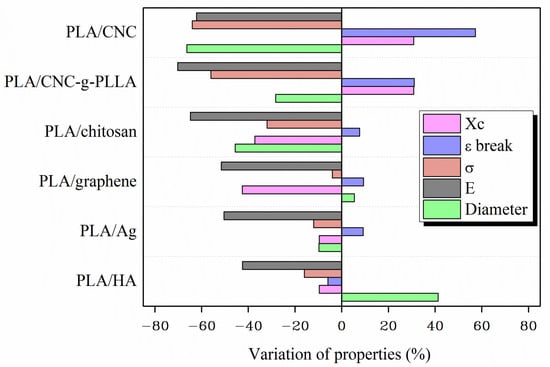 Finally, for a global understanding of the morphology and the thermal and mechanical behavior of all of the PLA-based e-fibers, the variation of their properties with respect to those of neat PLA are plotted in Figure 3. In this way, a better visualization of the effect of the addition of different organic and inorganic NPs on the main properties of the electrospun nanocomposites can be obtained. Tg and Tm were not plotted, as no detectable differences were found between the different systems.