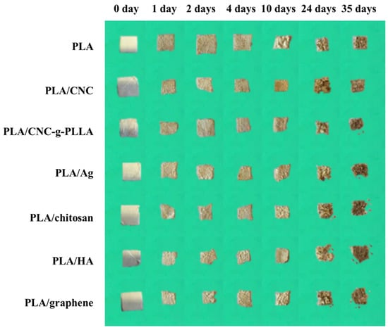 Additionally, a composting disintegration experiment was performed on the PLA-based e-fibers. In Figure 4, photographs for the electrospun nanocomposites degraded for different numbers of days under composting conditions are shown.