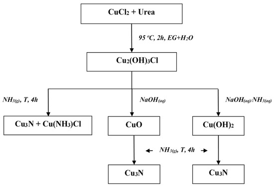 - Nakamura, T.; Hayashi, H.; Ebina, T. Preparation of copper nitride nanoparticles using urea as a nitrogen source in a long-chain alcohol. J. Nanoparticle Res. 2014, 16, 2699. [Google Scholar] [CrossRef]