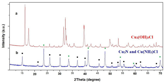 2.2. Characterization and Ammonolysis Reaction of Copper(II) Hydroxide Chloride Nanoparticles