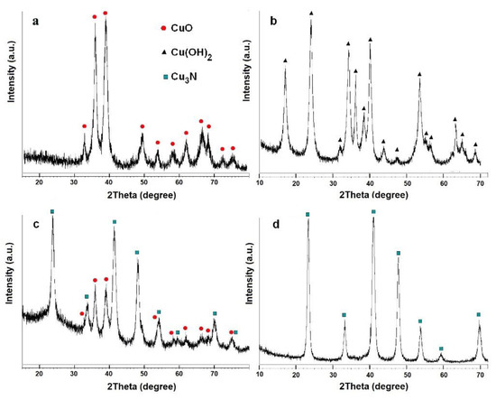 - Borsa, D.M.; Grachev, S.; Presura, C.; Boerma, D.O. Growth and properties of Cu3N films and Cu3N/γ′-Fe4N bilayers. Appl. Phys. Lett. 2002, 80, 1823–1825. [Google Scholar] [CrossRef] [Green Version]