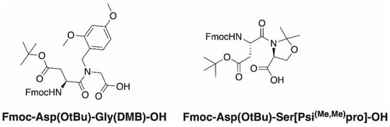 - Cardona, V.; Eberle, I.; Barthelemy, S.; Beythien, J.; Doerner, B.; Schneeberger, P.; Keyte, J.; White, P.D. Application of Dmb-Dipeptides in the Fmoc SPPS of Difficult and Aspartimide-Prone Sequences. Int. J. Pept. Res. Ther. 2008, 14, 285–292. [Google Scholar] [CrossRef]