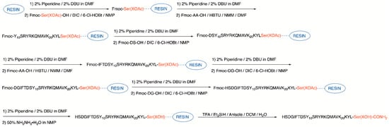 4.1.10. Manual Loading of Remaining Amino Acids Fmoc-Asp(tBu)-OH (5 and 6 Only), Fmoc-Ser(tBu)-OH, and Fmoc-His(Trt)-OH