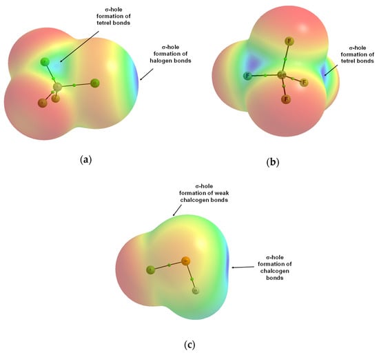 A similar situation to this one described for halogens occurs for other elements of main groups. In the elongation of bonds to the elements of 16, 15, and 14 groups, the regions of the positive EP are observed that often results in interactions of these elements with the electron donors [32,33]. The corresponding interactions are named as the chalcogen [49,50,51,52,53,54], pnicogen [55,56,57,58,59], and tetrel bonds [60,61,62,63,64], respectively. Even for noble gas elements such positive EP regions are observed that may be linked with the Lewis base units through aerogen bonds [65]. Figure 1 presents computed electrostatic potentials, EPs, on the 0.001 au surfaces of the electron density for the F3CCl, GeF4, and SeFH species.