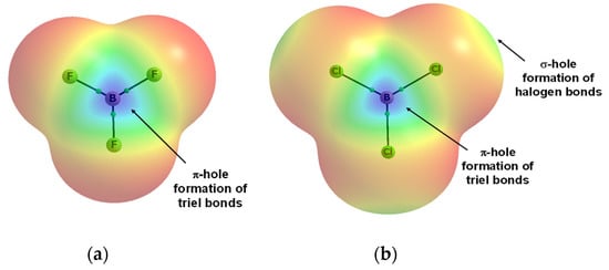 Figure 2 shows EP surfaces characterized by the electron density of 0.001 au for the BF3 and BCl3 molecules. For both species, the π-hole possessing positive EP at boron centre occurs. The surfaces at BF3 fluorine atoms are characterised by negative EP while for the BCl3 molecule, the σ-holes are observed at chlorine centres in elongations of the B-Cl bonds. In such a way the BCl3 species may interact with electron donors forming triel bond (through boron) and halogen bonds (through chlorines).