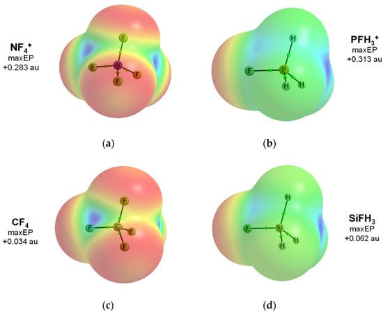 The electrostatic potentials for surfaces of the electron density of 0.001 au for NF4+ (a), PFH3+ (b), CF4 (c) and SiFH3 (d) species; from the maximum positive EP (blue) to the minimum negative EP (red); the EP values correspond to MP2/aug-cc-pVTZ results.