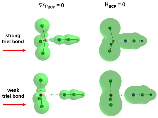 For example, for the weaker interaction the trigonal structure of BCl3 is only slightly deformed and for the strong one this deformation is directed towards the tetrahedral structure. The so-called reactive surfaces of two conformations of the Cl3B∙∙∙NCH complex are presented in Figure 5 that correspond to the zero values of the Laplacian of the electron density (∇2ρ) or of the total electron energy density (H). It is well known that the negative value of ∇2ρ at the bond critical point, BCP (∇2ρBCP), corresponding to an interatomic link considered, indicates the covalent character of interaction [115,116]. However, if the ∇2ρBCP is positive the negative value of H at BCP (HBCP) indicates the partially covalent character of interaction [117,118,119,120]. The positive HBCP value (and consequently positive ∇2ρBCP) is attributed to weak and to medium strength interactions. One can see that for the Cl3B∙∙∙NCH configuration linked by the weak interaction, the B∙∙∙N BCP is located outside both surfaces of ∇2ρ and H of the zero value, therefore both ∇2ρBCP and HBCP are positive. For the Cl3B∙∙∙NCH conformation linked by the stronger interaction, ∇2ρBCP is positive and HBCP is negative as the reactive surfaces show (Figure 5).