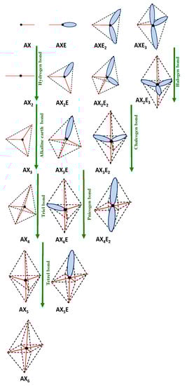Figure 8, as a whole, is of more general meaning since it presents the configurations predicted by the VSEPR approach where not only bonds that influence the molecular shapes are taken into account but also lone electron pairs. The AXnEm designations applied in this figure should be understood in the same way, as it was described earlier here. To simplify these designations, the differences between n ligands linked with A-centre are not specified.