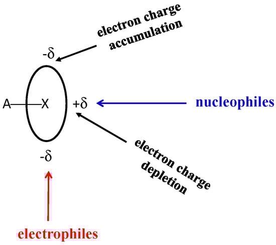 The other explanation of the unique properties of halogens is based on the σ-hole concept [45,46,47]. According to this concept, the depletion of the electron charge in the elongation of the A-X bond results in the increase of electrostatic potential in this region, up to positive values. This region is named as the σ-hole. The latter depletion of the electron charge at the halogen is connected with the inclusion of this electron charge in the A-X sigma bond. Consequently, the excess of the electron charge in the perpendicular direction and near to this direction also occurs. It is worth to note here that not only the depletion of the electron charge in elongation of bonds is responsible for the positive electrostatic potential at the Lewis acid centre; the important contribution of the nucleus cannot be ignored [48].