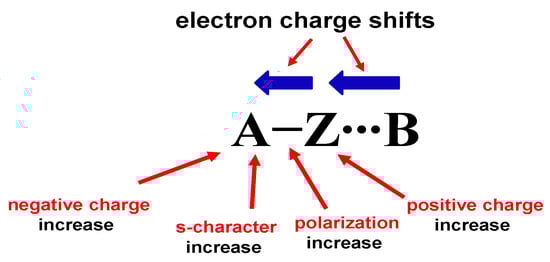 Scheme 2 presents main processes that accompany the formation of hydrogen (Z = H) or halogen (Z = X) bond [106]. It is also approximately in force for other σ-hole and π-hole interactions [12,24,25,74]. The Z centre that obeys the octet or doublet rule if interacts with any electron donor ligand may contain excess of the electron charge since the electron charge transfer from the B unit into the A-Z one is the main characteristic of the Lewis acid—Lewis base interactions. This could lead to hypervalency, but other phenomena also occur [25]. There is the further electron charge transfer from the Z-centre to the remaining part of the unit, mainly to the A-centre [25,100,101]. Thus, the increase of the positive charge of Z-centre is usually observed. These processes of the electron charge shifts were analysed for the halogen and hydrogen bonds in detail. Two other effects are observed as results of the formation of interaction, the increase of the polarization of A-Z bond and the increase of the s-character of the A orbital of A-Z bond. The interrelations between the s-character and other parameters for various hydrogen bonds were analysed in detail by Alabugin and coworkers [107] and further this analysis was performed for other interactions [108].