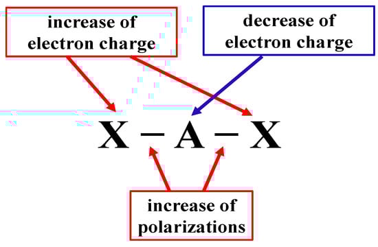 There are interesting interrelations between the positions of bonds and lone electron pairs. For example, in the trigonal bipyramid structure, TBP, the positions of vertices are not equivalent. This non-equivalency is discussed by Gillespie and Hargittai and its relation to positions of lone electron pairs and bonds was discussed [102]. However, it is also worth referring here to the ω 3c/4e hypervalent bonds discussed by Weinhold and Landis [101]. The latter concept explains correctly the locations of electron pairs. The lone electron pairs are usually characterised by electron occupancy equal to two or very close to this value. The bonds on the other hand, especially if they are strongly polarized, have occupancies sometimes much lower than two. This is why, for example, in the AX3E2 TBP structure the lone pairs occupy the positions in the triangle (see Figure 8). The lone electron pairs, neither one nor two, in TBP structures are directed to the axial vertices. Why? Because in such a case it is not possible to obey the octet rule. If the lone pairs are directed to vertices of the triangle thus the axial XAX arrangement may be considered as the ω 3c/4e hypervalent bond where both A-X links are strongly polarized, and where the shifts of the electron charge to the X-centres occur (see Scheme 3). The bond orders of the “partial” A-X bonds are lower than one (electron occupancies lower than 2). In such a way, the eight-electron valence shell of the A-centre is exceeded only slightly (if any). This is worth noting since three centres of the ω hypervalent bond have to be linear or nearly so [101]. Hence, it seems that following TBP structures contain such hypervalent bonds (the above mentioned AX3E2, as well as AX2E3, and AX4E). One can also expect the hypervalent bonds in the following octahedron (Oc) structures: AX6, AX5E, and AX4E2. The occurrence of the AX3E3 structure is less probable since in such a case only one hypervalent 3c/4e bond is possible and this does not prevent the excess of electrons above eight in the valence shell of the A-centre; it does not follow the octet rule.