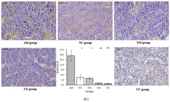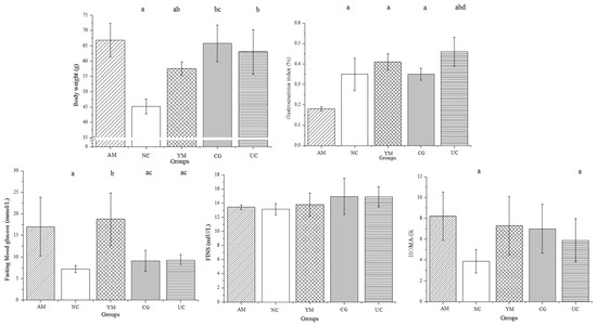 FBG levels were less than 9.0 mmol/L in the CG and UC groups, i.e., lower than those in the AM and YM groups (>15 mmol/L; p < 0.05), but the levels were slightly larger than in the NC group (<7.5 mmol/L; p > 0.05). There was no significant difference in FINS between the different groups. Homeostatic model assessment of insulin resistance (HOMA-IR) is an index that evaluates the level of insulin resistance. The NC group showed the lowest HOMA-IR, and the HOMA-IR index of the UC group was significantly lower than in the AM group (p < 0.05).