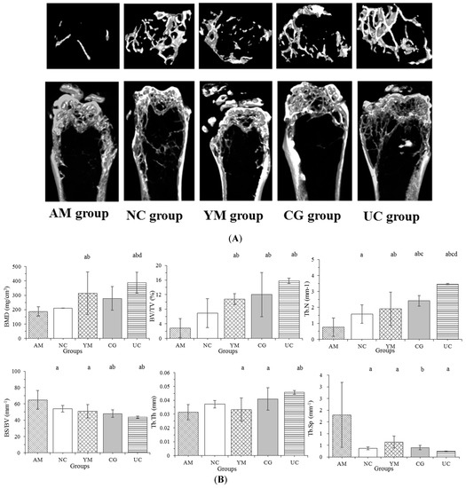 The histomorphometry of the femur in the five groups. (A) The images of the changes in bone microarchitecture. (B) The mineral density and histomorphometry of the femur. The data are expressed as the means ± SD (n = 5 in the AM group, n = 7 in the YM, CG, NC, and UC groups); a p < 0.05 versus the AM group, b p < 0.05 versus the NC group, c p < 0.05 versus the YM group, d p < 0.05 versus the CG group.