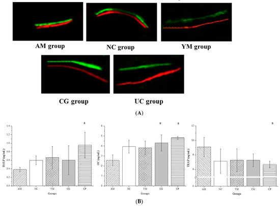 In order to investigate the effect of Native Collagen II on oxidative stress, the activity of superoxide dismutase (SOD), glutathione peroxidase (GSH-Px), and malondialdehyde (MDA) in the serum of the mice was examined. As shown in Figure 4B, compared with the AM group, the other groups showed obviously stronger activities of SOD and GSH-Px and a significantly lower MDA level (p < 0.05). Regarding the MDA content, values in the UC group were the smallest among the five groups (significantly; p < 0.05), whereas there were no significant differences between the SOD and GSH-Px activity found in the two intervention groups (p > 0.05).