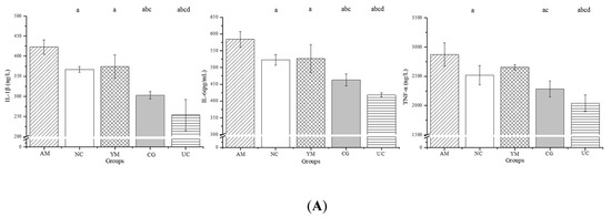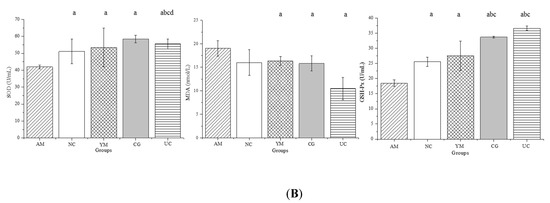 Serum levels of inflammatory cytokines and oxidative stress in the five groups. (A) Serum levels of inflammatory cytokines including IL-1β, IL-6, and TNF-α; (B) serum levels of oxidative stress indexes including MDA, SOD, and GSH-Px. Serum data are expressed as the means ± SD (n = 5, 7, 9, 9, and 10 in the AM, CG, UC, NC, and YM groups); a p < 0.05 versus the AM group, b p < 0.05 versus the NC group, c p < 0.05 versus the YM group, d p < 0.05 versus the CG group.