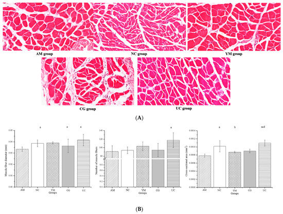 We had known that the gastrocnemius decreased in the AM group and the Native Collagen II intervention could increase the gastrocnemius mass. The gastrocnemius morphological characteristics and pathology are shown in the Figure 5A,B. Muscle cells in the AM group lost their normal morphology, the nuclear center migration phenomenon was serious, and the cells showed remarkable differences in size and had a disordered, loose arrangement. In addition, the intercellular substance level increased, and there was a large amount of connective-tissue hyperplasia and inflammatory cell infiltration between muscle cells. Similarly to the AM group, the intercellular substance level in the CG group increased, and there was a large amount of fibrous connective-tissue hyperplasia and inflammatory cell infiltration; however, it was inconsistent because the CG group showed normal cell morphology, uniform sizes, and a slight nuclear center migration phenomenon. Compared with the AM and CG groups, the NC and YM groups showed less fibrous connective-tissue hyperplasia and inflammatory cell infiltration, and the cells were uniform in size and tidily arranged. UC resulted in a normal polygonal cell without degenerating necrotic cells, uniform size, tightly arranged, and with the disappearance of disorderly connective tissue and inflammatory cells.
