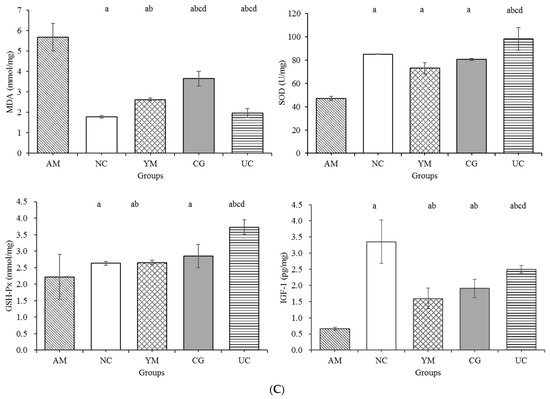 H&E staining of the gastrocnemius muscle and its characteristic parameter. (A) H&E staining of the gastrocnemius. The bar indicates 50 μm. Magnification: 40×. (B) Diameter, number, and cross-sectional area of muscle fibers. (C) Biomarkers including oxidative stress and monokines IGF-1. The data are expressed as the means ± SD, n = 5; a p < 0.05 versus the AM group, b p < 0.05 versus the NC group, c p < 0.05 versus the YM group, d p < 0.05 versus the CG group.