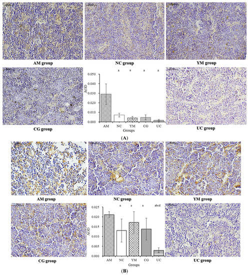 Immunohistochemistry analysis of the five groups. Magnification: ×400. IHC quantification is shown in the bar graphs. (A) Protein expressions of IL-1β in the femur; (B) protein expressions of RANKL in the femur; (C) protein expressions of TRAP in the femur. The data are the means ± SD (n = 5, 7, 9, 9, and 10 in the AM, CG, UC, NC, and YM groups); a p < 0.05 versus the AM group, b p < 0.05 versus the NC group, c p < 0.05 versus the YM group, d p < 0.05 versus the CG group.
