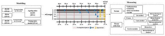 All the mice were exposed to the intervention for 12 weeks. In the later stage of the intervention period, weight loss showing a sharp decrease (approximately >20% loss of body weight) was an indication of the dying stage, and if a mouse appeared to be dying due to weight loss or injury, it was euthanized with CO2 to minimize suffering. One-quarter of all the mice or one-third of one group approaching death were considered to signify the end of the experiment (here, the intervention lasted 12 weeks). At the end of the experiment, the surviving mice (n = 10, 13, 14, 14, and 15 in the AM, CG, UC, NC, and YM groups, respectively) were euthanized with CO2, and blood was obtained from the retrobulbar plexus using heparinized anticoagulant tubes for further measurements. After euthanasia, the main organs were weighed to calculate organ coefficients. Some separated right femurs from the mice injected with a dye (n = 5 in each group) were fixed in 10% neutral buffered formalin for dynamic histomorphometry; the left femurs of these mice were packed in a gauze soaked with phosphate-buffered saline and stored at –20 °C to carry out the three-point test; the right gastrocnemius of these mice was separated and stored at –80 °C to perform biomarker measurements, including oxidative stress and myokines; and the left gastrocnemius of these mice was fixed in 10% neutral buffered formalin for histopathological analysis. The mice without an injection in each group provided serum and femurs to measure biomarkers, and for microcomputed tomography (CT) and histopathological analysis; histopathological analysis for the right femur also required decalcification with 10% EDTA (changed each week). The schematic diagram of the research protocol is shown in Figure 7.