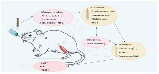 Figure 4 shows that TNF-α, IL-6, and IL-1β levels in the serum were significantly decreased in the UC group. In previous cases of osteoarthritis, Native Collagen II was documented to promote a significant reduction in inflammation [74]. Figure 4, Figure 5 and Figure 7 show the relationship between inflammation and bone resorption (TRAP). Therefore, the osteoclasts overactivated by inflammation play a vital role in imbalanced bone metabolism [75]. Thus, inhibiting osteoclastogenesis through suppressing inflammation is an important strategy for improving bone degeneration [76]. Correspondingly, the positive expression of Il-1β in the CP group was decreased compared with that in the AM group (Figure 6A). IL-1β, IL-6, and TNF-α, common proinflammatory cytokines, can stimulate osteoclast activity with the macrophage colony-stimulating factor (M-CSF) and its receptor, c-Fms, which modulate the pool of available precursor cells for differentiation via the actions of RANKL [44]. These osteoclast-activating factors interact with a proven final common mediator of osteoclast differentiation and activation, receptor activator of nuclear factor-kB (RANK) and its functional ligand (RANKL). RANK is a membrane-bound TNF receptor expressed on osteoblast precursor cells that recognizes RANKL through direct cell–cell interactions, an essential process for the differentiation of osteoclasts from their precursor cells. RANKL, an essential factor for osteoclast differentiation and function, is also expressed by lymphocytes and synovial fibroblasts and may mediate bone loss associated with inflammatory conditions [37], which promotes the bone-resorbing activity of osteoclasts and prolongs their survival [38]. Similarly, the immunohistochemical analysis showed RANKL had a higher expression in the AM group, and low expression was observed in the CG and UC groups. The same tendency was shown in TRAP expression, which means that Native Collagen II decreased RANKL and TRAP expression. In this study, Native Collagen II decreased bone resorption by inhibiting serum cytokines, as well as IL-1 and IL-6 expression, and then inhibited the expression of RANKL and TRAP. In this study, it was speculated that Native Collagen II could improve bone impairment due to increasing bone mineralization and formation, decreasing bone resorption, which partly resulted from muscle function and IR improvement through decreasing oxidative stress and inflammation (Figure 8). This conclusion was partly proved in other studies [28,77].