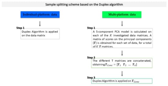 In order to perform external validation of the models, a reorganization of data into a training and a test set was necessary. In a situation in which the instrumental analysis would be conducted by means of an individual technique, this could be achieved by direct application of a resampling algorithm (such as Duplex [38]) but this was not possible with a multi-platform data set. The application of the Duplex algorithm on the individual data blocks would not simultaneously allow consideration of the variability present in the two matrices. In order to overcome this issue, a solution based on principal component analysis (PCA) [39,40] proposed by Firmani et al. [41], and schematized in Figure 1, was applied. Consequently, a PCA model was calculated on each set of mean-centered data. The samples’ scores, along the first 5 principal components of each model (arranged in the matrices and ), were extracted and concatenated row-wise, obtaining the row-augmented score matrix (]). Eventually, the Duplex algorithm was applied on and signals divided into a training and a test set of 23 and 10 samples, respectively.