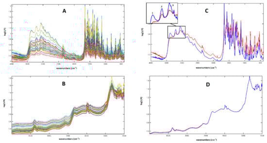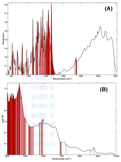 These observations are also confirmed by the most influencing NIR variables (Figure 4B). The features presenting a VIP index of higher than 1 are those ascribable to the combination of N-H vibrations (symmetric or asymmetric stretching with NH2 scissoring or rocking), giving rise to the peaks between 4500 and 5020 cm−1 and to the combination of the C=O and OH stretching modes at about 5290 cm−1 in which the second overtone of C=O stretching also falls. Lastly, a significant contribution of the first overtone of the aromatic C–H stretching at about 5950 cm−1 is also observed.